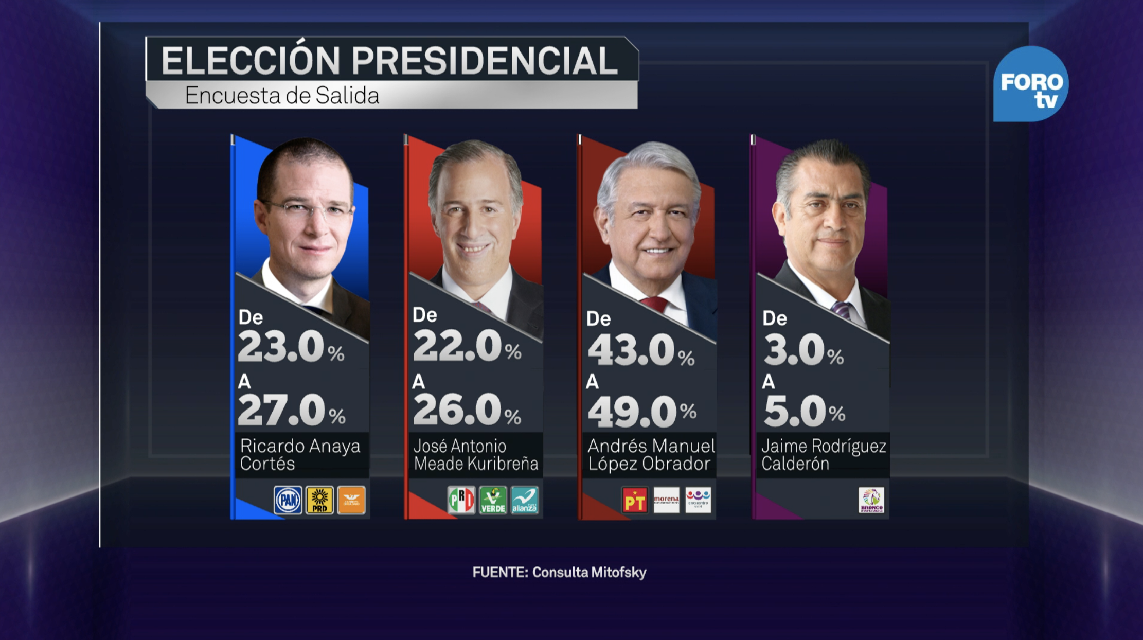 Al cierre de las casillas electorales, Consulta Mitofsky difundió los resultados de las encuestas de salida que realizó durante la jornada electoral, dando una amplia ventaja a la coalición Juntos Haremos Historia en distintos estados.